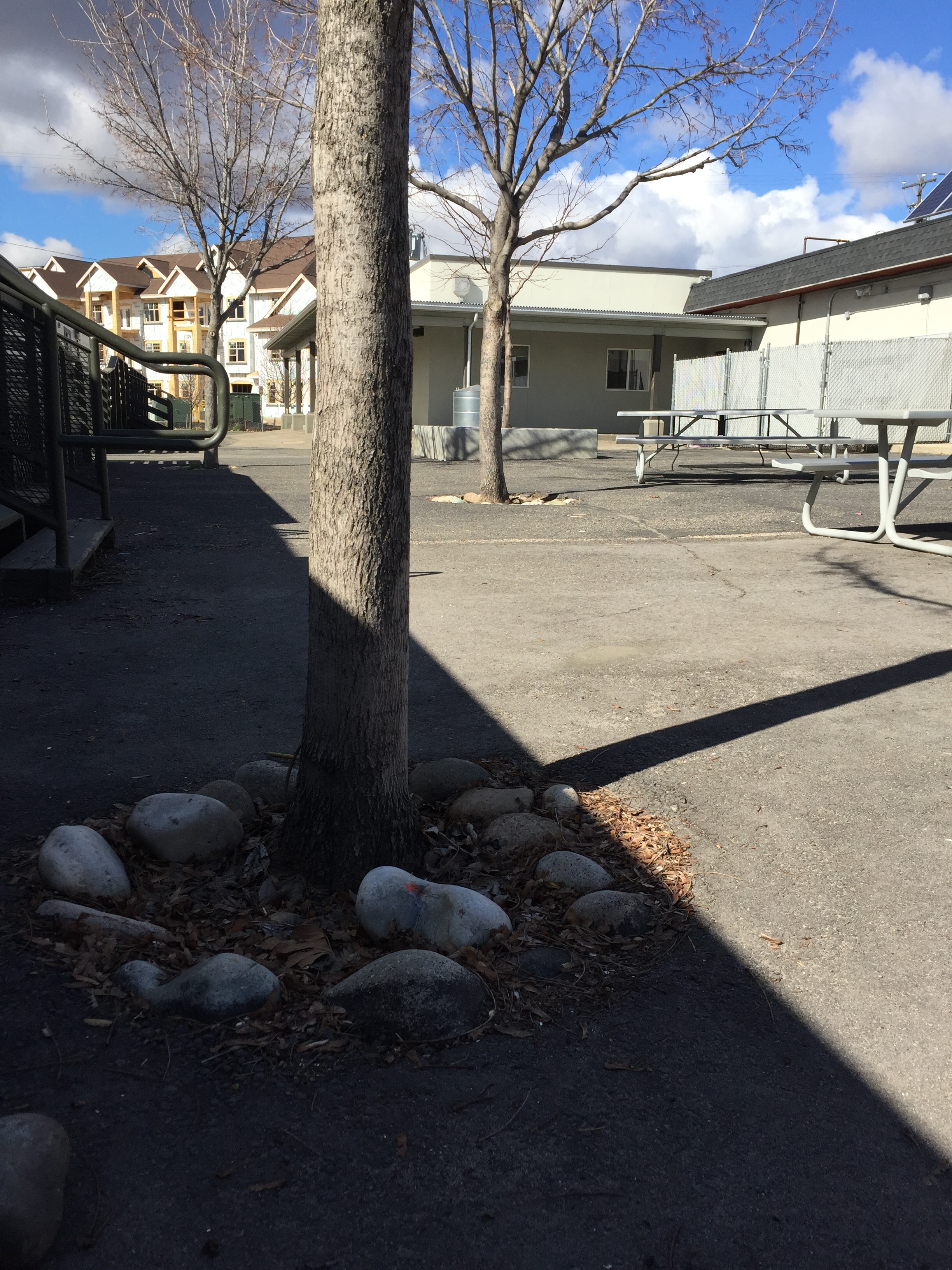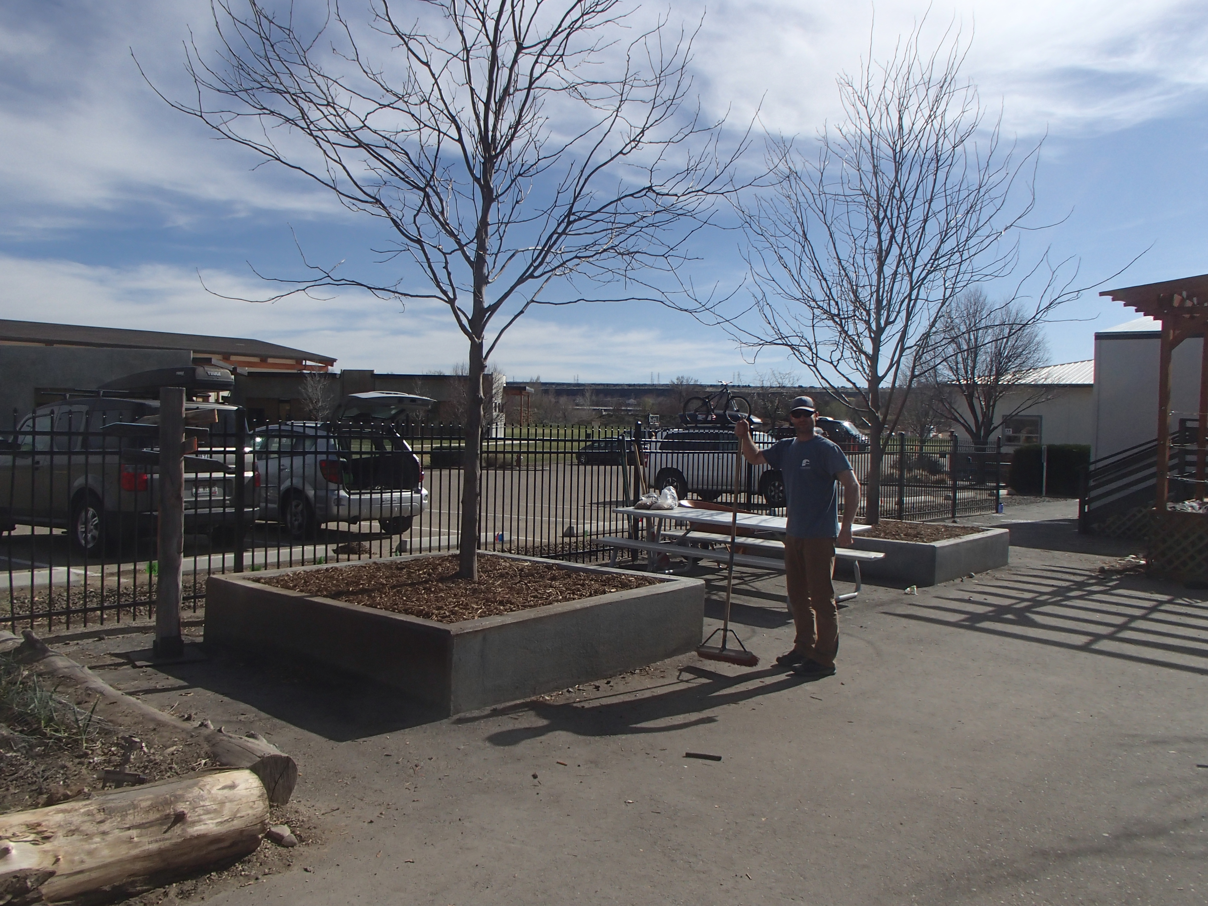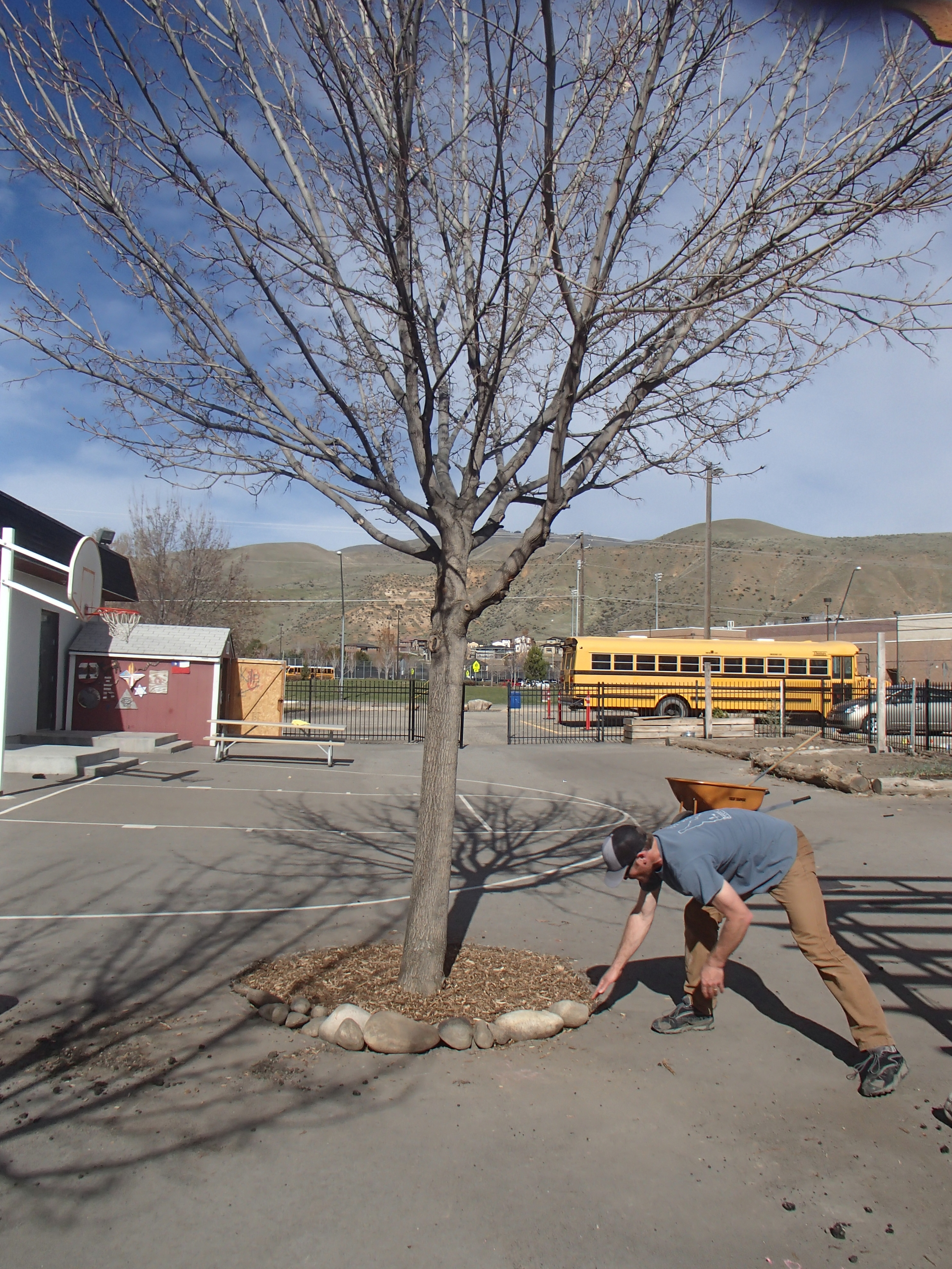 We discovered that one of the old Earth Day projects, a tree planting in the quad, had outgrown its installation. After over 10 years in the pavement, these trees needed more space! It was time to give the trees some TLC, increase the aerobic zone for root development, increase the catchment area to capture more precipitation, feed the roots and soil with arborist chips (kindly donated by the City of Boise) and formalize the tree rings to protect the soil and roots (and of course, make things look nice). Making the trees healthier will help to prevent future disease outbreaks and reduce the need to treat or replace the trees.